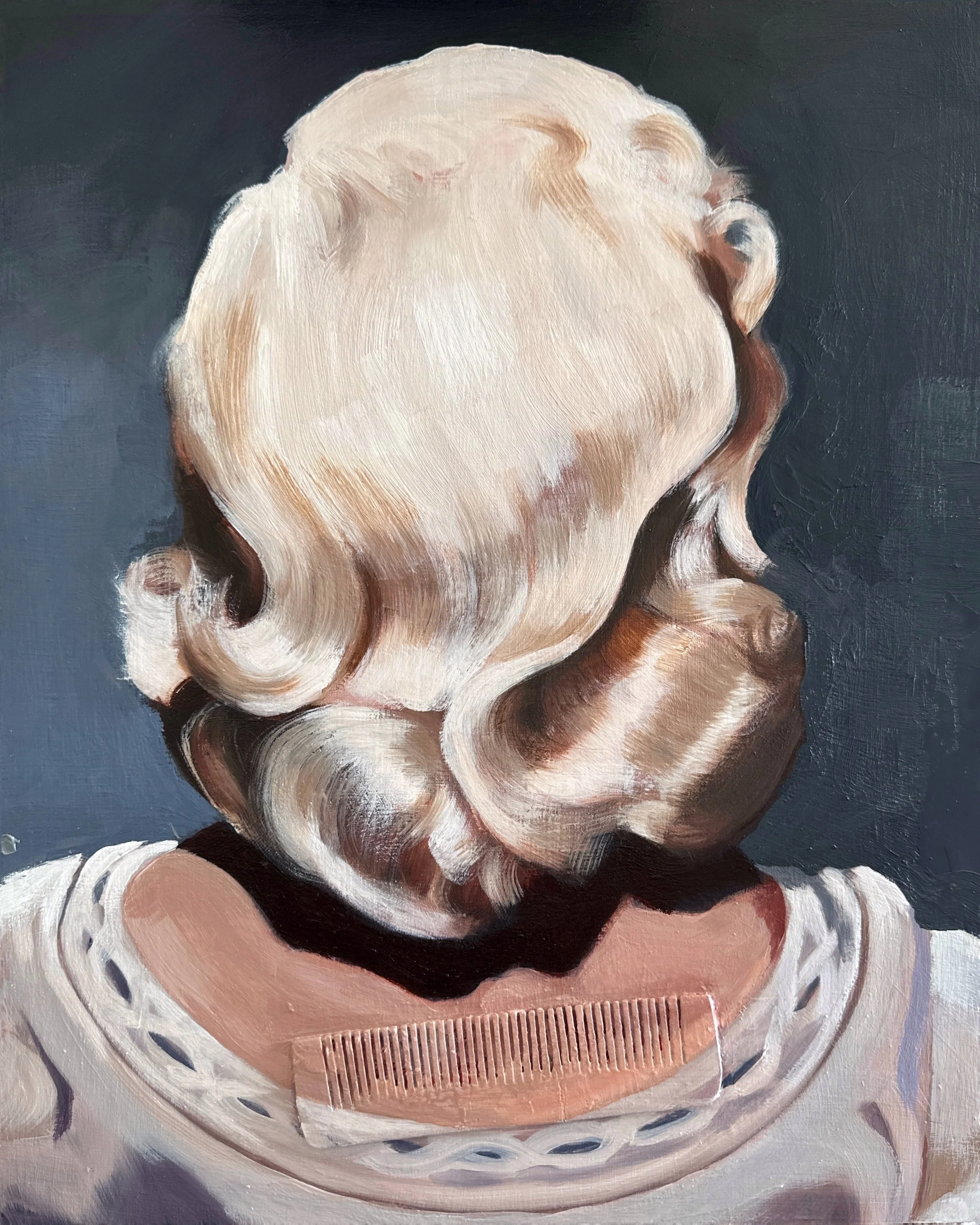 Head of Woman with Comb, 2022. Oil and wooden comb on cradled wood Panel, 35.5x28x3.7cm