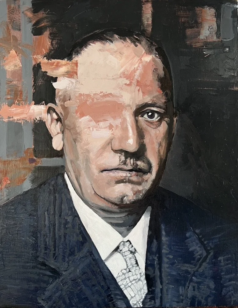Study of seated man (The Industrialist), 2022. Oil on cradled Wood Panel, 40x33x1.8cm